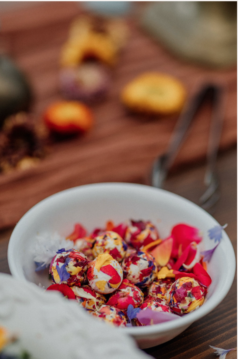 A custom curated seasonal spread of savory and sweet bites served on a stunning local Redwood slab with non-alcoholic herbal libations